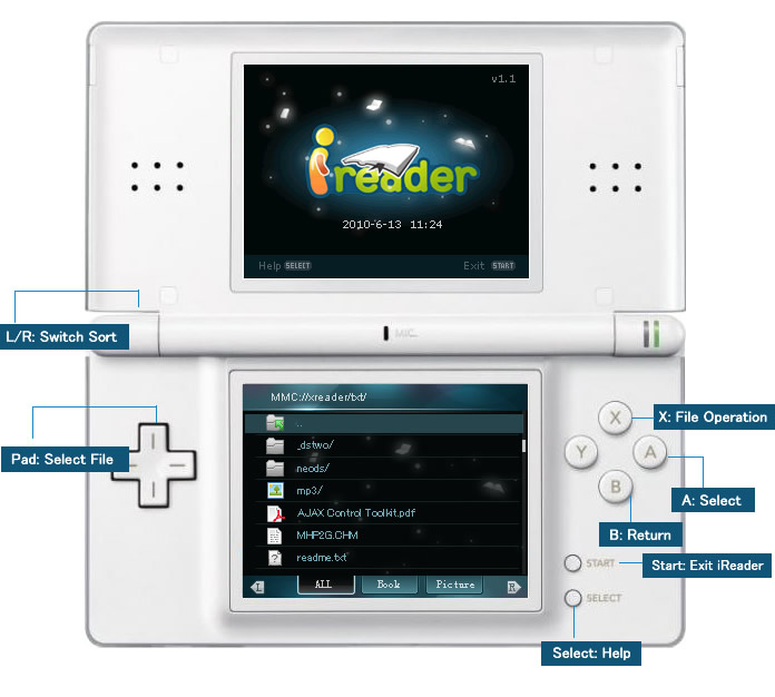 Install: To install simply release iReader_Vx.x.rar and copy the iReader and ther _dstwoplug folder to root directory of your SD card,overwrite the old version.After these operation, you can see iReader and _dstwoplug.